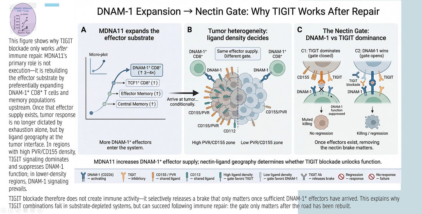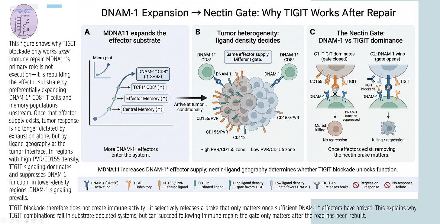 This observation reframes the clinical failure of TIGIT programs not as a dismissal of the TIGIT/CD226 axis, but as evidence of its dependency on upstream integrity. TIGIT blockade relies on renewable CD226⁺ effector populations, which MDNA11 helps restore. Thus, the DNAM1⁺ expansion signals not downstream amplification, but successful repair of upstream immune assembly, enabling functional effectorization. In essence, this data does not position MDNA11 as a “better” alternative to TIGIT; it clarifies why TIGIT lacked viability in populations where lymph-node priming had collapsed, highlighting therapies that operate upstream as a distinct category.