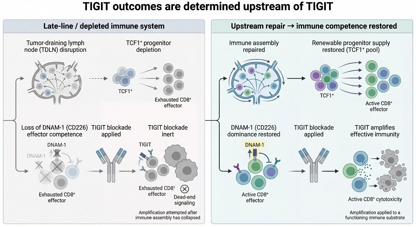 A practical diagnostic rule follows from this. A TIGIT result is only interpretable if the system still satisfies three upstream conditions: (1) DNAM-1⁺ effector competence exists, (2) renewable progenitor supply remains (i.e., the TCF1⁺ engine is not depleted), and (3) trafficking from tumor-draining lymph nodes to tumor is intact. If any one of these is broken, failure does not falsify TIGIT biology—it only confirms that amplification was attempted after assembly had already collapsed. In that sense, many late-line TIGIT readouts were not “negative trials.” They were structurally non-diagnostic experiments. When viewed through this lens, the outcome of late-line TIGIT trials becomes almost inevitable.