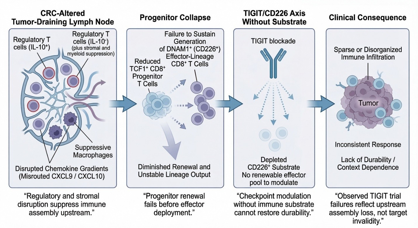 While the schematic below is drawn from colorectal cancer—where TDLN disruption, progenitor collapse, and checkpoint refractoriness are well characterized—the logic it depicts is not CRC-specific. It reflects a general failure mode of downstream checkpoint blockade when immune assembly has already collapsed. CRC is shown here because it makes the sequence visible, not because the mechanism is unique.