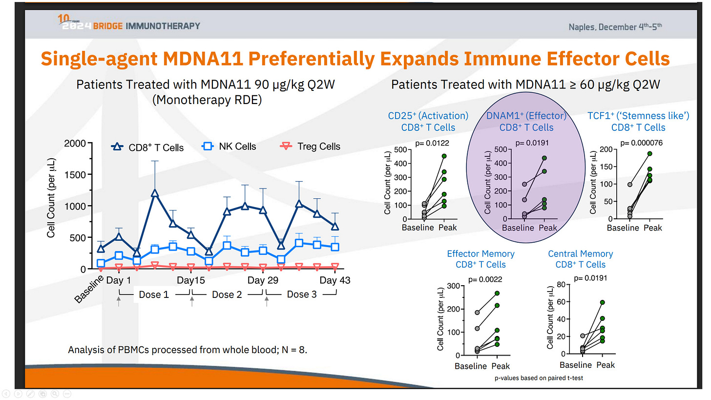 These data illustrate that immune expansion following MDNA11 is not consumptive. Progenitor-linked and DNAM-1⁺ effector populations are preserved in parallel, maintaining renewable immune capacity rather than depleting it.