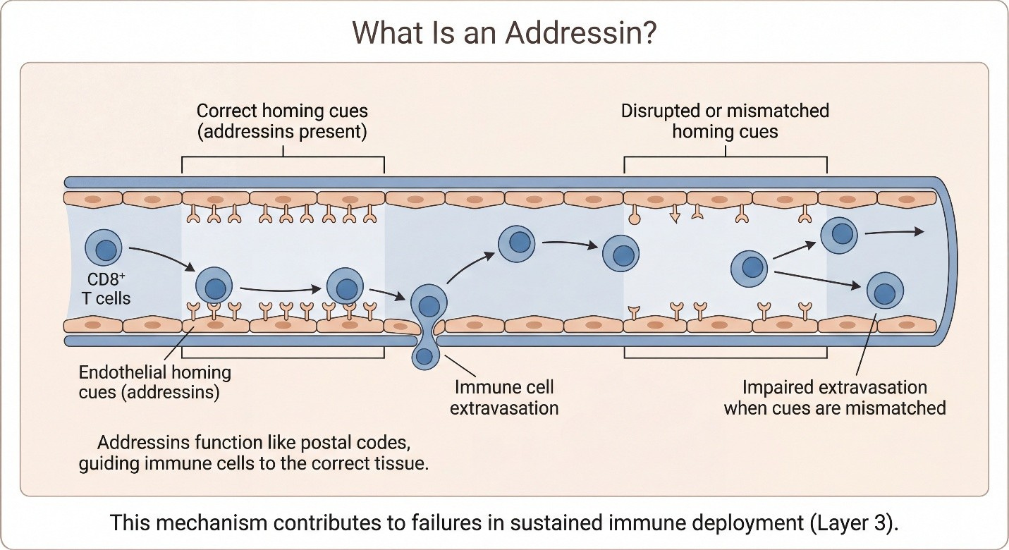 Clinical TIGIT data make this limitation visible. Robust target engagement consistently yielded inconsistent, non-durable, and context-dependent responses — exactly what would be expected when deployment-phase modulation is applied to patients with compromised tumor-draining lymph nodes due to prior therapy, disease burden, metabolic stress, or stromal disruption.