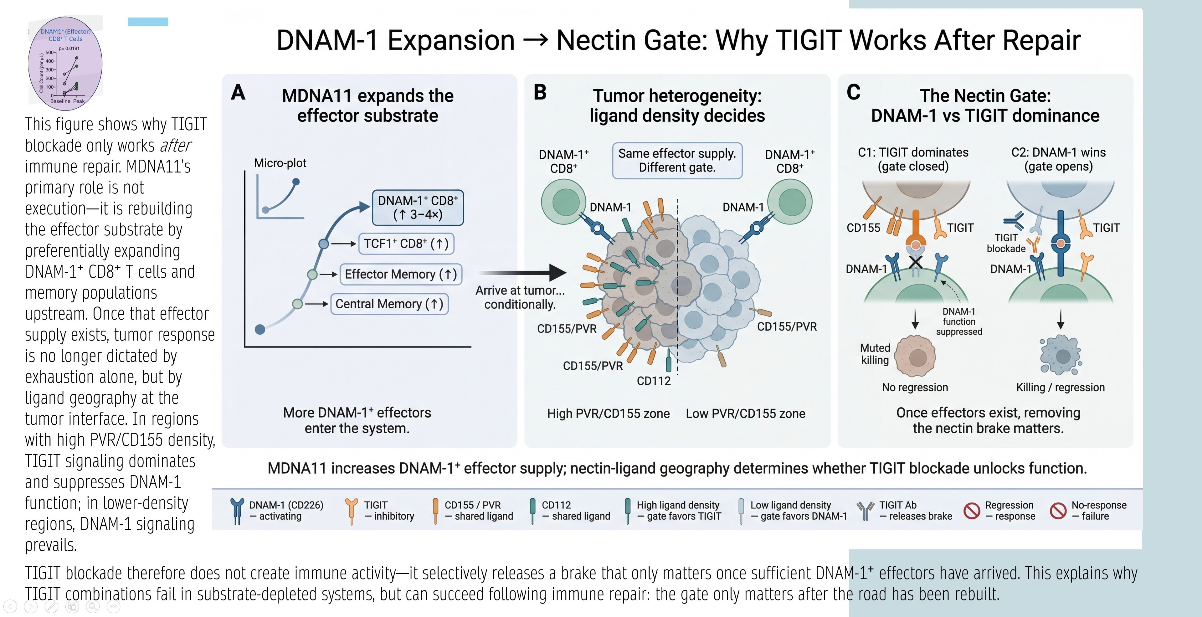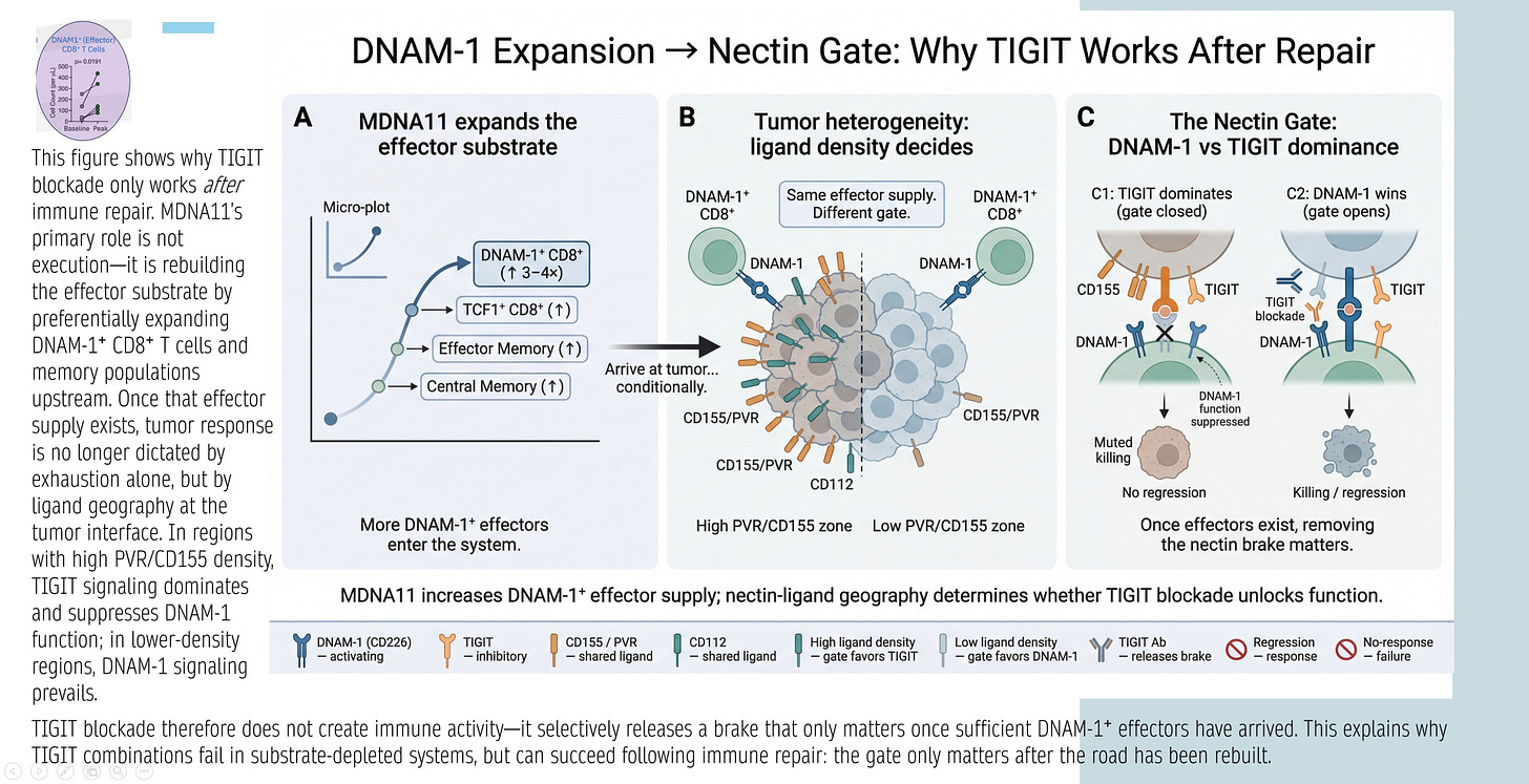 This explains a long-standing paradox in the TIGIT literature: why TIGIT blockade appears potent in early or less-treated models, yet collapses in advanced disease despite abundant ligand expression. The determinant is not whether TIGIT is present. It is whether DNAM-1 is still operational. In other words, DNAM-1 competence is not a correlative biomarker — it is the mechanistic switch that decides whether the nectin axis is actionable at all.